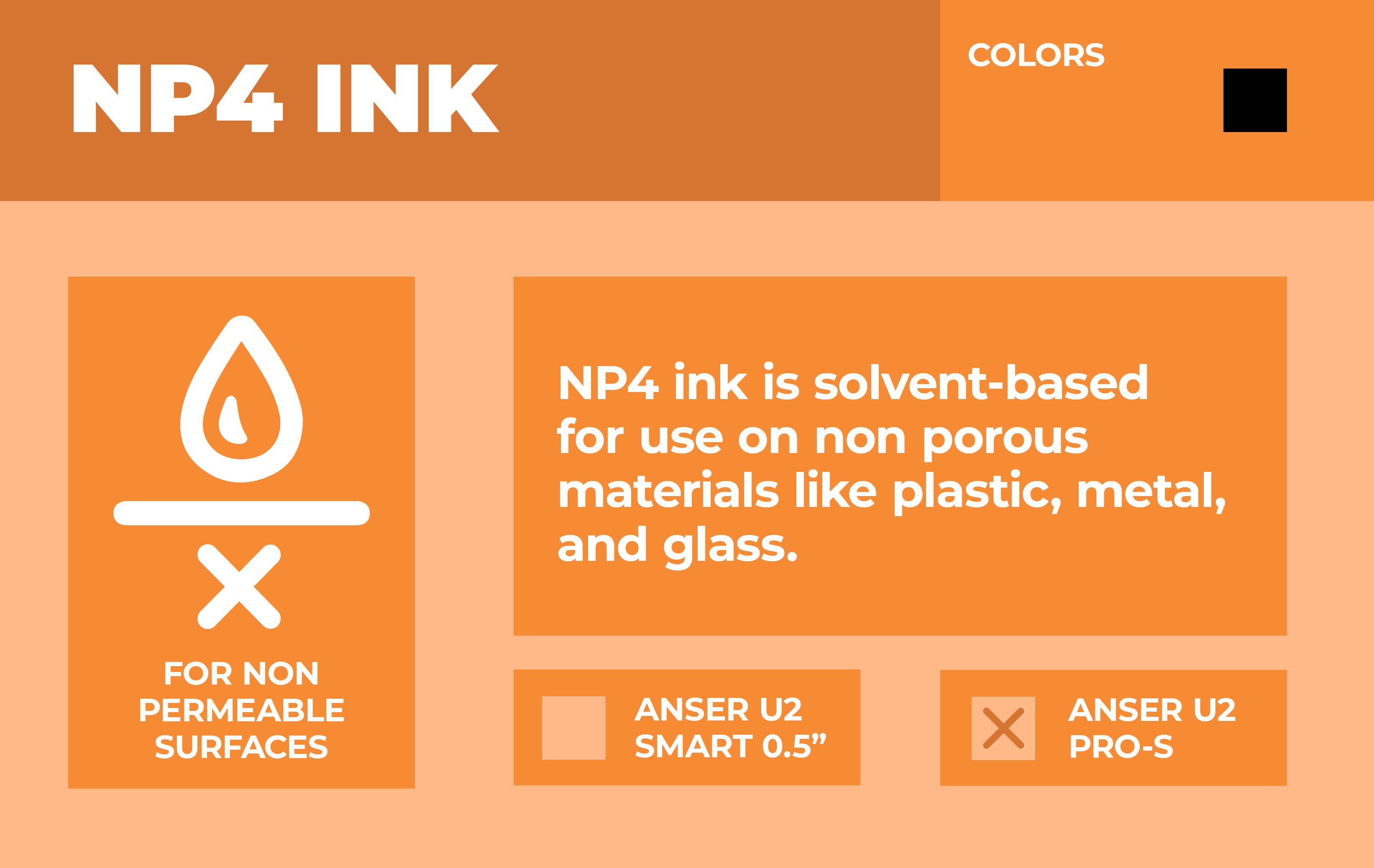 NP4 black ink is dries quickly on nonpermeable like plastic, steel, aluminum, and glass. It is available exclusively for the Anser U2 Pro-S printer.